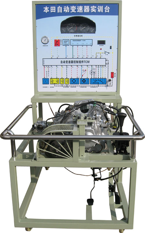 本自動變速器實訓臺是本公司采用日本本田公司自動變速器為適應汽車教學需求而研制的,該實訓臺由電控變速器(八成新)、操作顯示面板及發動機彩色電氣原理圖電腦控制柜、可移動式臺架(萬向腳輪)、驅動系統(腳踏式油門踏板)變頻電機驅動、剎車系統(腳踏液壓盤試剎車)、啟動系統(電門鎖方式啟動)、車速傳感器、電磁閥執行器、原車電腦、具有發動機運轉及顯示(轉速.車速.檔位)、液壓油壓力顯示表(顯示換檔過程油壓)、自動變速器電磁閥工作指示LED燈、原車診斷座、進行失速實驗等、故障設置區可設置8路故障(老師設置任一路線路故障)、故障排除區(學生通過各種儀器、儀表、)在面板上用專用排故線連接排除故障、傳感器信號模擬等多項功能、具結構緊湊、操作方便、安全可靠、教學直觀、是汽車自動變速器實物教學不可缺少的實驗室設備之一。
