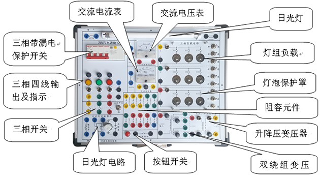 (4)三相燈組負(fù)載,每相可插入15W燈泡3只。
