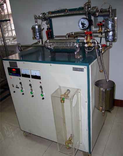 電蒸汽鍋爐、套管換熱器、蒸汽冷凝罐、蒸汽及水流量測試設備、加熱由固體調壓模塊無級調節,由多路巡檢儀顯示的溫度測試系統,不銹鋼臺架及控制屏等。