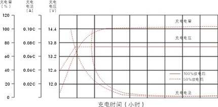 鉛酸蓄電池要求采用限流恒壓的充電方法進行充電。在環境度為25℃的條件下,最佳的浮充電壓為13.6±0.1V 臺X臺數,充電開始時的電流應限制在0.25C10A的范圍內。