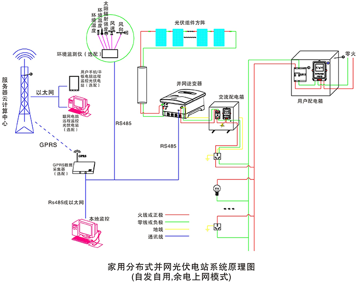 在晴朗的白天,裝在屋頂上的光伏組件發出的直流電經過并網逆變器逆變成與電網同頻率同相位的單相交流電給負載進行供電,在夜晚或陰雨天等太陽光照不足的情況下,系統處于待機狀態,負載用電全部來自電網。您可以通過系統監控軟件來實時查看系統的運行狀態和故障信息,或者是選配遠程通訊數據采集器,將系統工作數據通過GPRS或以太網,傳輸到您的手機、平板電腦或任意一臺聯網的電腦,以便于您遠程實時掌控電站的信息。