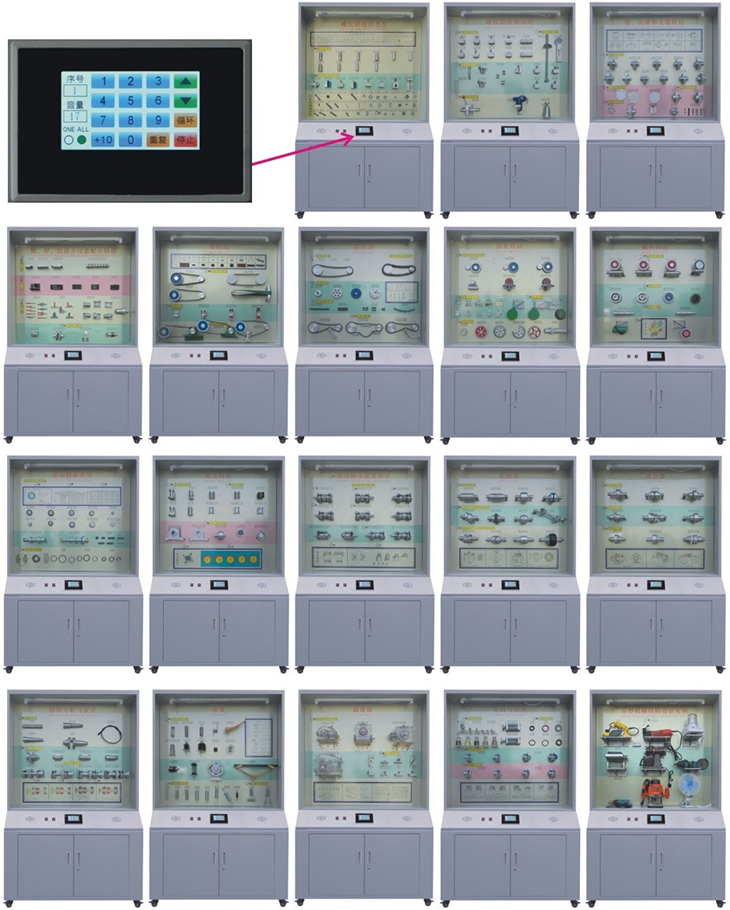 機(jī)械設(shè)計(jì)零件陳列柜,是根據(jù)機(jī)械設(shè)計(jì)(零件)課程基本要求設(shè)計(jì)制造的實(shí)驗(yàn)設(shè)備。陳列柜通過機(jī)械零件模型或?qū)嵨铮浜舷鄳?yīng)的圖文資料,形象地展示與解說機(jī)械設(shè)計(jì)的基本知識(shí),加強(qiáng)學(xué)生對(duì)通用機(jī)械零件的類型、結(jié)構(gòu)特點(diǎn)及其設(shè)計(jì)的感性認(rèn)知,為進(jìn)一步學(xué)習(xí)機(jī)械設(shè)計(jì)奠定基礎(chǔ)。