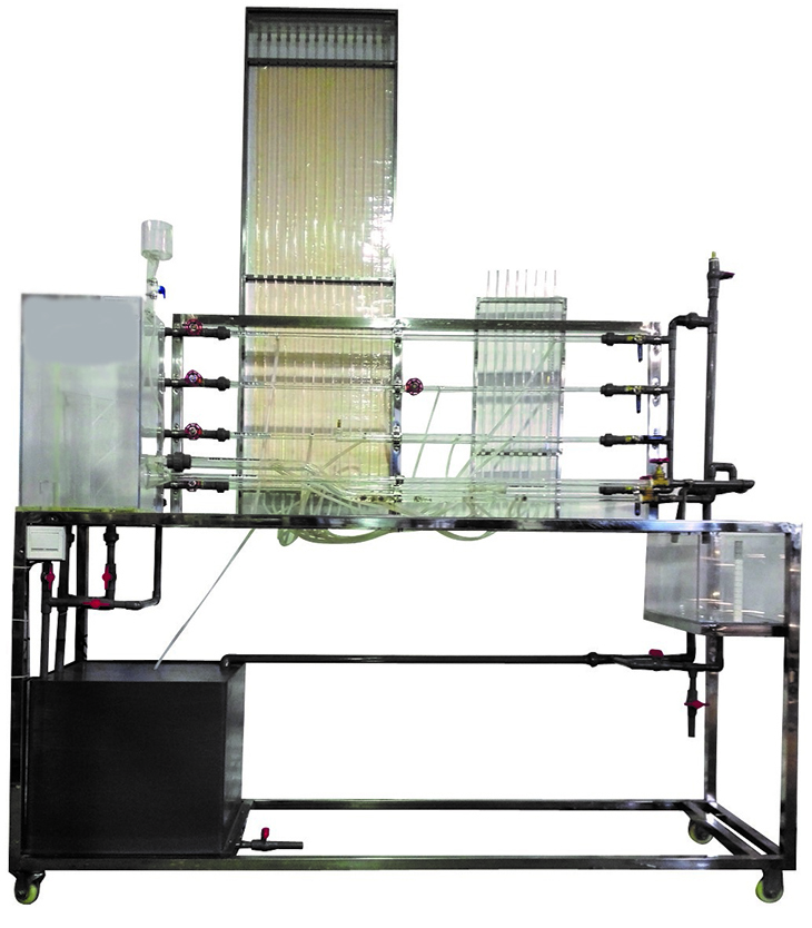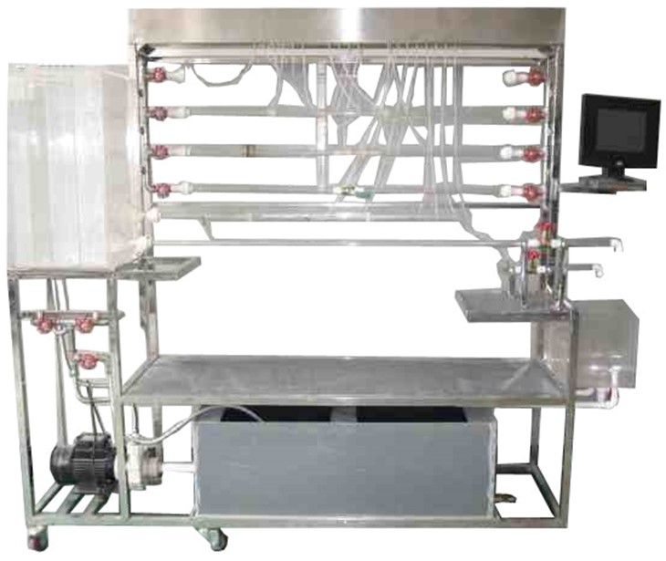 移動式不銹鋼實驗臺、儲水箱;雷諾測試管;伯努利測試管;沿程阻力系數測試管;突擴、突縮測試管;閥門局部阻力系數測試管;孔板流量計測試管;文丘里流量計測試管;和皮托管測試管;測壓板直接顯示總水頭線和測壓管水頭線;壓力傳感器24套、流量傳感器4套、溫度傳感器1套、觸摸屏、測壓板。