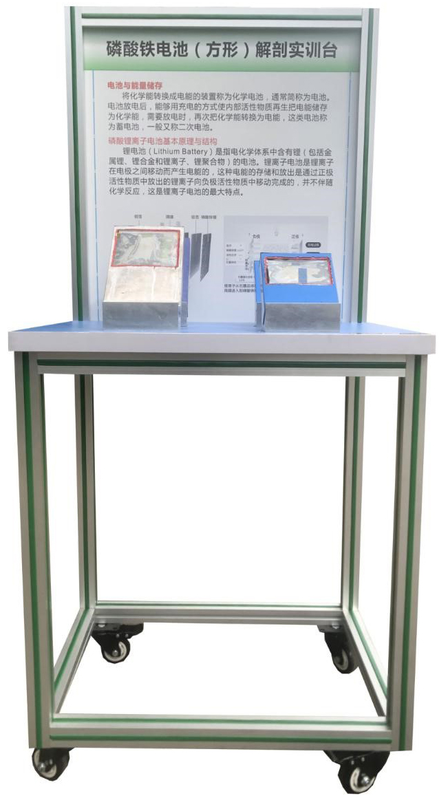 3.實訓臺由可移動臺架與原理面板組成,面板立放,繪制三維立體解剖結構圖,介紹單體電池基本知識,展示磷酸鐵鋰動力電池基本參數。
