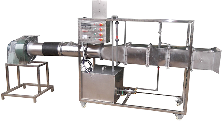 循環(huán)防腐水泵,轉(zhuǎn)子流量計(jì)、風(fēng)冷冷凝器,翅片管式換熱器,風(fēng)洞實(shí)驗(yàn)段,多翼式低噪音離心風(fēng)機(jī),自動(dòng)調(diào)節(jié)風(fēng)門(mén),笛形管及差壓測(cè)風(fēng)速裝置,加熱由固體調(diào)壓模塊無(wú)級(jí)調(diào)節(jié),控制測(cè)試儀表箱,不銹鋼加熱水箱,8路萬(wàn)能信號(hào)輸入巡檢儀顯示溫度、水和風(fēng)的阻力及風(fēng)速。